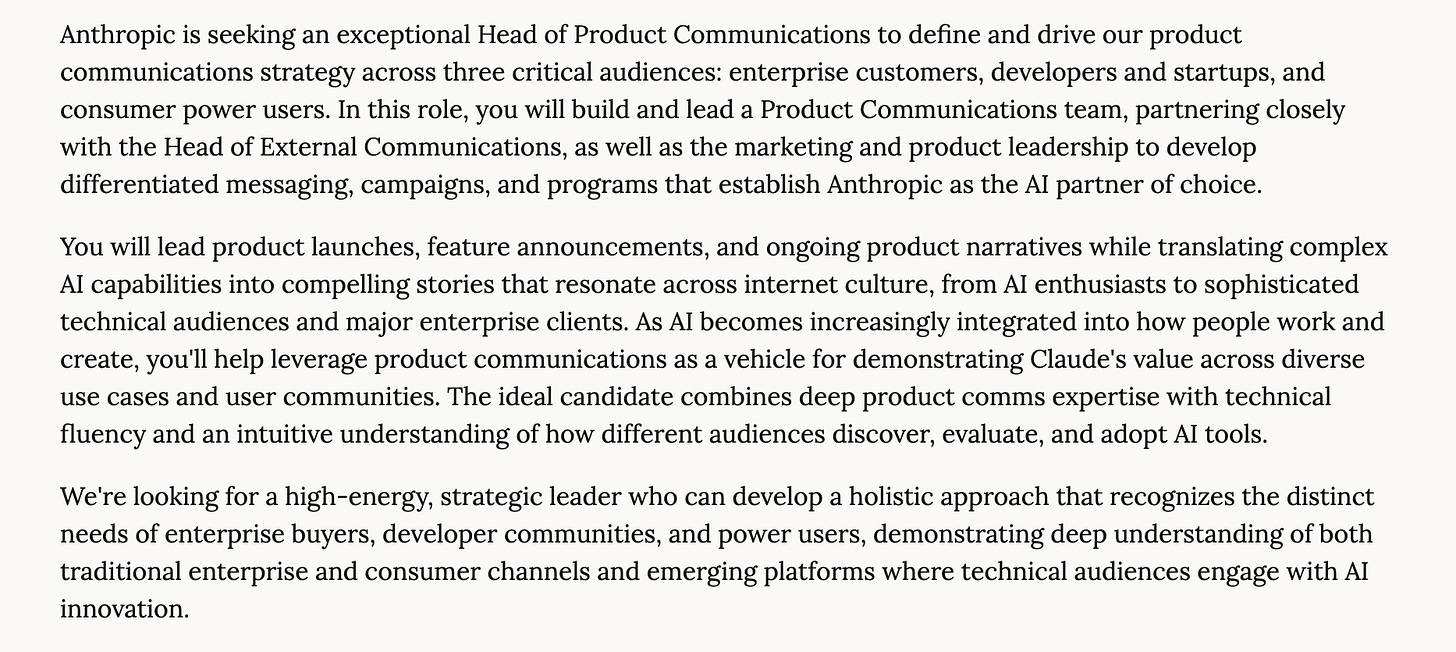 The tenor of many of these postings are the same: companies need writers to lead creative. Occasionally, it’s for big bucks: Anthropic, the same AI company that had to shell out USD$1.5 billion to authors for using their books to train Claude, the company’s AI, is currently looking for a head of product communications. Salary? A cool USD$400,000.