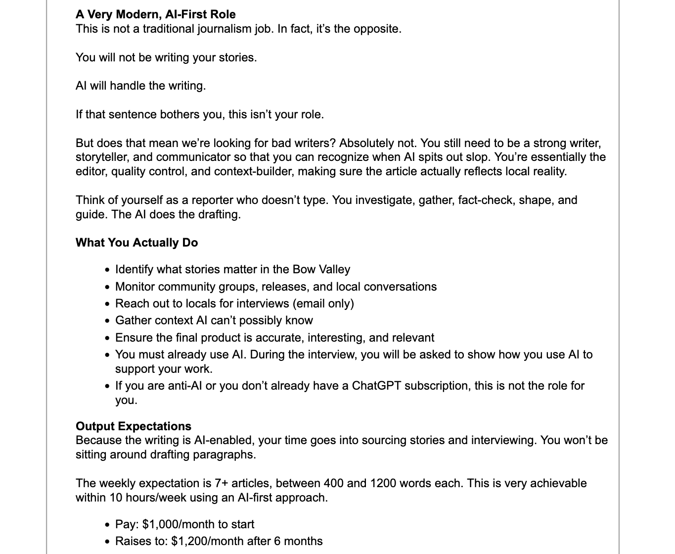 What makes job postings like those painfully ironic is how different they read from some job descriptions at actual journalism outlets. I was alerted to this job posting from Bow Valley Insider, a local newsletter based in Canmore, AB, a few days ago.